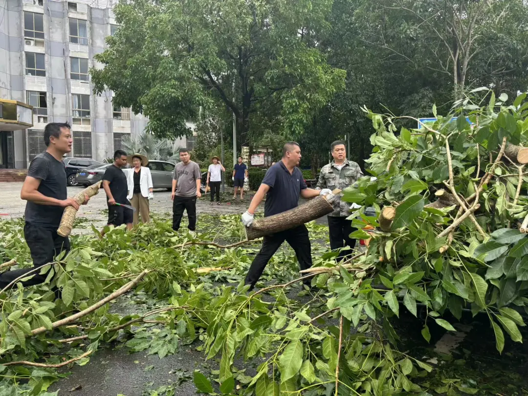 9月7日一大早,儋州市蘭洋鎮,海南農墾旅游集團有限公司和海南橡膠西聯分公司組織黨員干部在路面上,移走倒伏的大樹,清理斷枝殘葉。